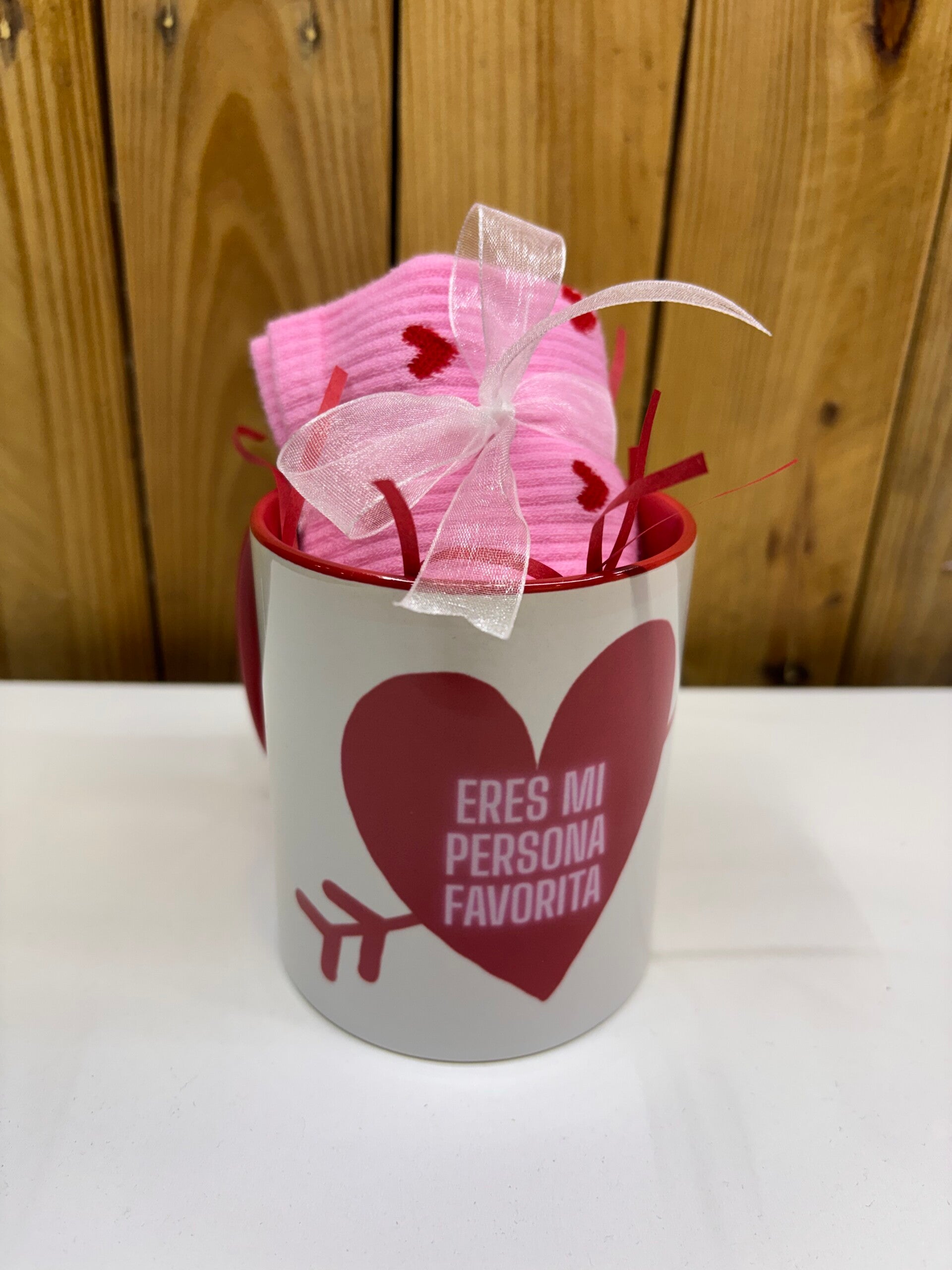 Taza personalizada eres mi persona favorita, y calcetín corazones rosita, talla única.